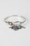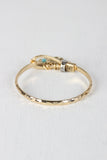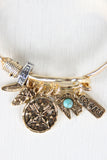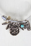 This bangle features hammered metal detailing, hook and loop closure, 6 decorative charms one with the words "Be Brave And Keep Going".