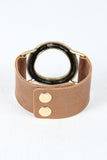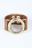 This stylish bohemian bracelet features a wide vegan leather band in metallic finish, golden open circle embellishment, and double button snap closure.
