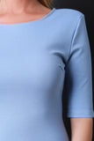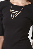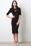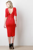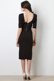 This chic dress features a round neckline, v-back to a gold-tone zipper fastener, quarter-length sleeves, stretchy sculpture fit, and a vent slit at back hemline. Accessories sold separately. Made in U.S.A. 33% Nylon, 62% Viscose, 5% Spandex.
