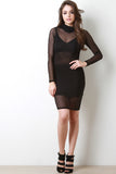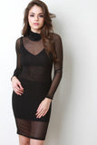 This two piece dress features a semi-sheer mesh fabrication, turtle neckline, long sleeves, detachable spaghetti strap lined dress with a v-neck, mini length hem, and semi-sheer mesh midsection. Accessories sold separately. Made in U.S.A. 90% Polyester, 10% Spandex. Lining: 95% Rayon, 5% Spandex.
