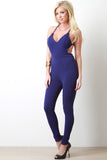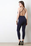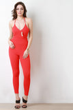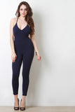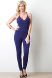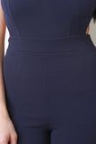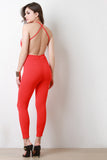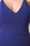 This jumpsuit features a v-neckline, spaghetti shoulder straps to a crisscross backless design, high waisted cinched seam, zipper rear, and taper cut legs. Accessories sold separately. Made in U.S.A. 96% Polyester, 4% Spandex.