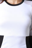 This midi dress features a round neck, two tone color design, long sleeves and semi-sheer on the upper sleeves. Accessories sold separately. Made in U.S.A. 95% Polyester, 5% Spandex.
