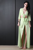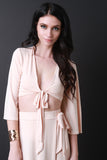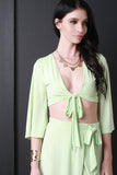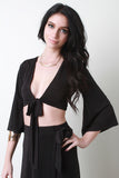 This crop top features a plunging v-neck with tie at center front, three quarter bell sleeves, and cropped hemline. Accessories sold separately. Made in U.S.A. 95% Polyester, 5% Spandex.