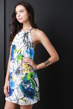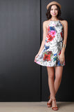 This beautiful swing dress features a sleeveless cutaway design, spaghetti drawstring neckline, open back with a single button closure, shift cut fit, floral pattern print, and fully lined. Accessories sold separately. Made in U.S.A. 100% Polyester.