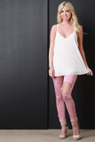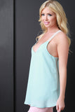 This top features a v-neckline, crochet detail lace strap, flowy semi-sheer fabrication, and hanging open back. Finished with an underlay. Accessories sold separately. Made in U.S.A. 100% Polyester.