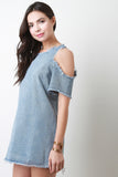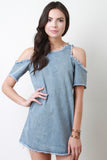 This denim dress features a shift cut fit, round neckline, short sleeves with cold shoulder cutout, fringe edges, and zipper fastener at back. Accessories sold separately. 90% Cotton, 10% Polyester.