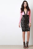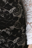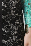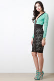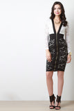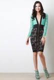 This stylish midi dress features semi-sheer floral lace fabrication, two tone colorblock design, plunging v-neckline, wide elasticized waistband, and longsleeves construction. Finished with an exposed front zip-up closure, and partially lined.