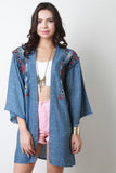 This stylish kimono features chambray fabric, tribal pattern stitching, open front, and raw edge extra wide sleeves. Accessories sold separately. 100% Cotton.