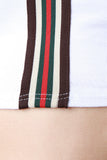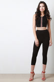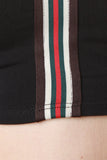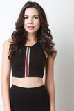 This sleeveless top features a round neckline, racer back, crop hemline, and vertical striped center ribbon accent. Accessories sold separately. Made in U.S.A. 95% Cotton, 5% Spandex.