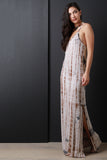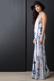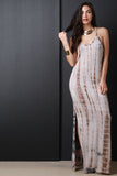 This jersey knit maxi dress features a sleeveless, scoop neckline, spaghetti shoulder straps to a racer back, side vent slits, and tie dye pattern print. Accessories sold separately. Made in U.S.A. 95 % Rayon, 5% Spandex.