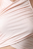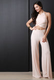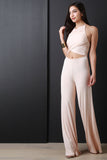 This jumpsuit features a halter neckline, wrap front, midriff cutout, wide flowing leg, elastic waist, and a soft knit fabrication. Accessories sold separately. 95% Rayon 5% Spandex.