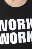 This crop top features a smooth stretchy knit fabrication, "WORK WORK" graphic print at front, scoop neckline, sleeveless fit, and cropped elasticized band hemline. Accessories sold separately. 100% Polyester.
