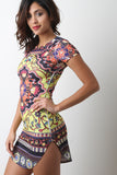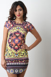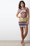 This dress features a smooth stretchy knit fabrication, vibrant lotus art print, round neckline, and cap sleeves. Finished with a rounded mini-length hemline. Accessories sold separately. Made in U.S.A. 95% Polyester, 5% Spandex.