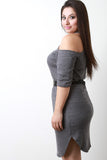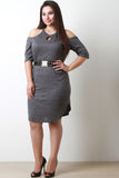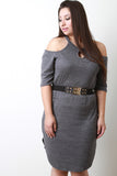 This ribbed knit plus size dress features a round neckline, short sleeves, cold-shoulder cutout, stretchy fit, and highlighted with a wide elasticized belt with gold-tone hardware. Accessories sold separately. Made in U.S.A. 97% Polyester, 3% Spandex.