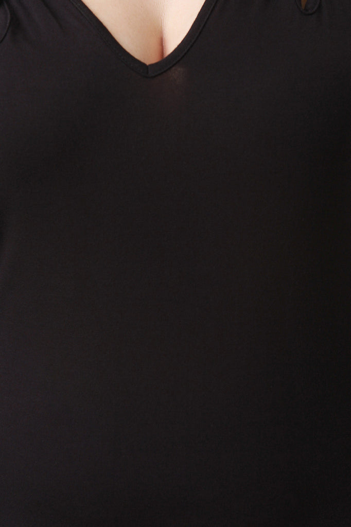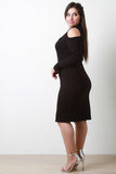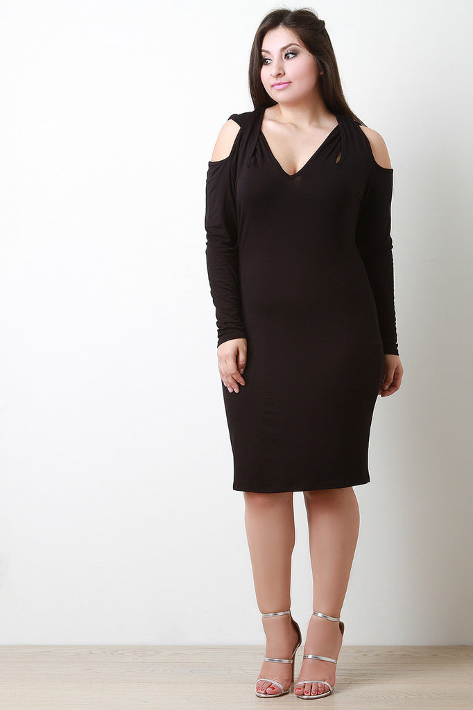 This dress features a v-neckline, crisscross shoulder straps, cold shoulder design, long sleeves, and sculpture fit. Accessories sold separately. Made in U.S.A. 95% Rayon, 5% Spandex.