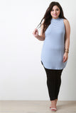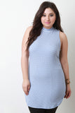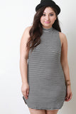 This plus size dress features horizontal stripe pattern on ribbed knit fabrication, mock neckline, sleeveless, and a rounded hemline. Accessories sold separately. Made in U.S.A. 95% Rayon, 5% Spandex.