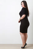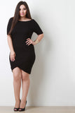 This plus size bodycon dress features an off-the-shoulder neckline, elbow sleeves design, stretchy sculpture fit, and an asymmetrical tulip hemline. Accessories sold separately. Made in U.S.A. 95% Rayon, 5% Spandex.