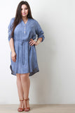 This cute and casual plus size dress features light wash chambray, button-up v-neckline, left breast pocket, quarter sleeves with button tab, midi length, curved hem, and finished with self-tie belt. Accessories sold separately. 100% Rayon.