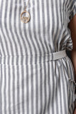 This dress features a relaxed fit, pinstripe design, round neckline, folded short sleeves, and a-line skirt. Finished with a self waist tie. Accessories sold separately. 65% Cotton, 35% Polyester.