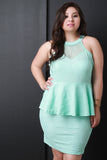 This alluring plus size dress features an embossed paisley fabrication with mesh contrast, round neck with button closure at nape, sleeveless design, and finished with bodycon peplum skirt. Accessories sold separately. Made in U.S.A. 95% Polyester, 5% Spandex.