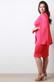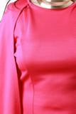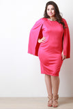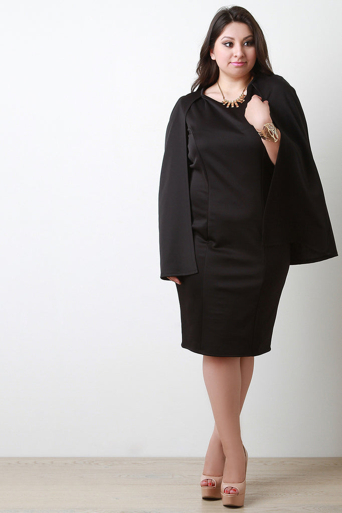 This eye-catching plus size cape dress features a flowing cape back with a classic round neckline, sleeveless design, and finished with a figure-flattering vertical seams. Accessories sold separately. Made in U.S.A. 95% Polyester, 5% Spandex.