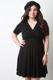 This dress features a ribbed knit fabrication, deep v-neckline and back, surplice faux wrap style, quarter sleeves, and elasticized cinched high waistline. Finished with a mini-length hemline. Accessories sold separately. Made in U.S.A. 71% Rayon, 25% Nylon, 4% Spandex.