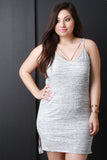 This dress features a marled ribbed knit fabrication, scoop neckline with thin v-line strap design, and sleeveless construction. Finished with a high low hemline with side slits. Accessories sold separately. Made in U.S.A. 90% Cotton, 7.5% Polyester, 2.5% Spandex.