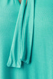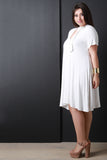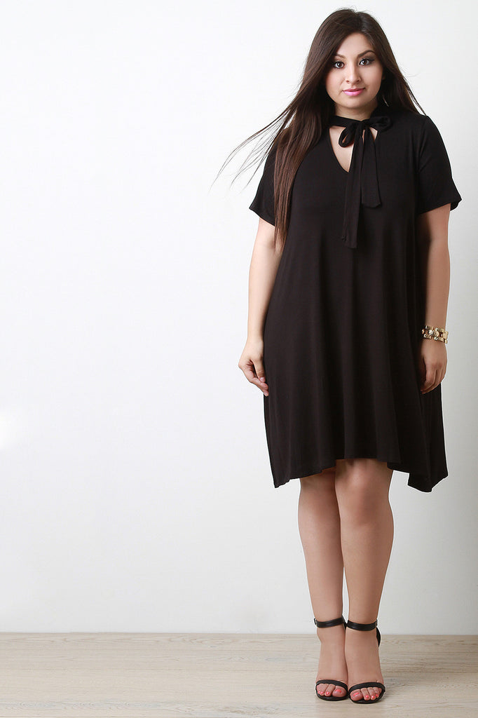 This cute plus size dress features a jersey knit fabrication, v-neckline with neck tie design, and short sleeve construction. Finished with a midi-length hemline. Accessories sold separately. Made in U.S.A. 95% Rayon, 5% Spandex.