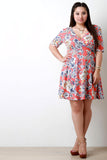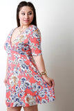 This dress features a stretchy knit fabrication with vibrant floral print, deep surplice v-neckline, and short sleeves fit. Finished with a high waist design. Accessories sold separately. Made in U.S.A. 95% Cotton, 5% Spandex.