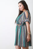 This dress features a woven knit fabrication, boho stripe print, lace up neckline, cold shoulder, and short sleeves. Finished with a cinched elasticized waist band, lined, and includes a belt. Other accessories sold separately. 100% Polyester.
