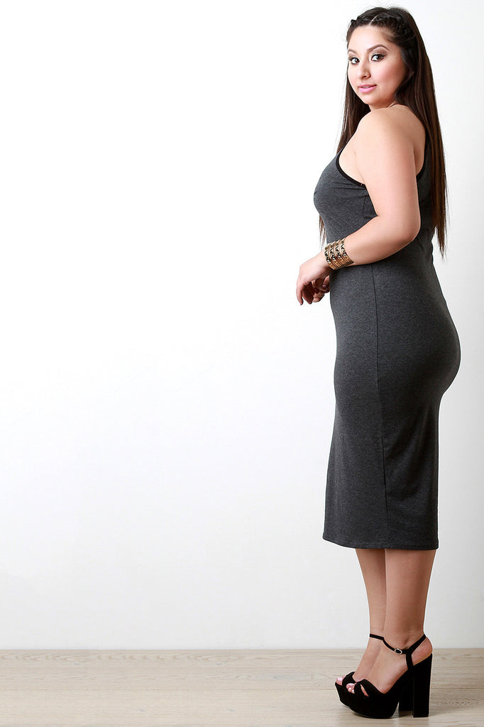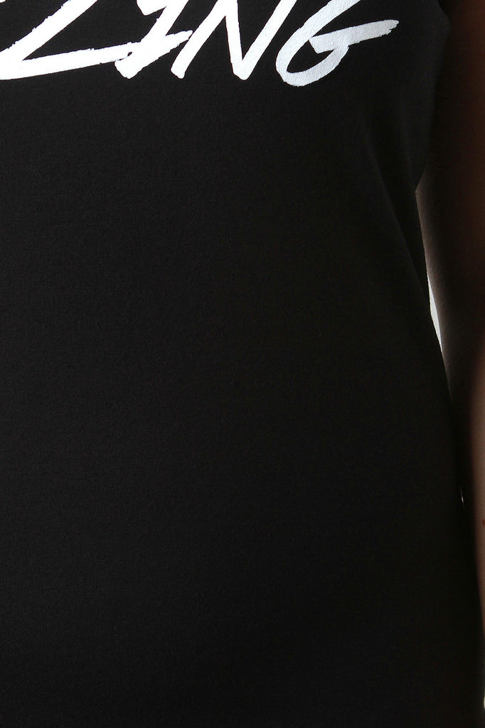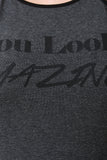 This dress features a "You Look Amazing" graphic print on a jersey knit fabrication, halter neckline, and midi-length hemline. Accessories sold separately. Made in U.S.A. 95% Cotton, 5% Spandex.