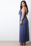 This plus size maxi dress features a soft jersey knit fabrication, strapless design, empire waist, and maxi-length hem. Top is partially lined. Accessories sold separately. Accessories sold separately. 97% Rayon, 3% Spandex.