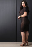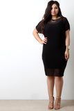 This plus size dress features a semi-sheer mesh overlay with a casual jersey knit dress under, bat wing sleeves, round neckline, and raw trimming and hemline. Accessories sold separately. Made in U.S.A. Self: 95% Nylon, 5% Spandex, Contrast: 96% Rayon, 4% Spandex.