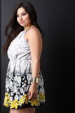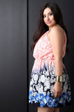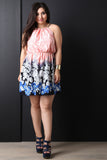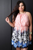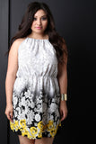 This beautiful plus size dress features a woven knit fabrication, floral print with contrasting color towards the hemline, halter neckline, self-tie drawstring closure at nape, and cinched waist. Accessories sold separately. Made in U.S.A. 100% Polyester.