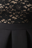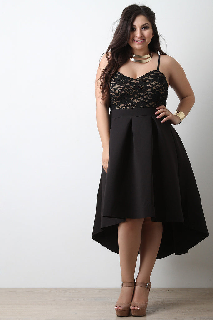 This plus size dress features a combo design with a floral lace upper half, sweetheart neckline, adjustable spaghetti shoulder straps, contrasting high waisted seam, scuba knit fabrication A-line skirt, box pleating and a high low hemline. Accessories sold separately. Made in U.S.A. 95% Polyester, 5% Spandex.