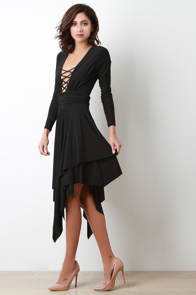 This midi dress features smooth stretch knit, plunge neckline with corset lace design, long sleeves, elasticized waist panel, and layered asymmetrical skirt. Accessories sold separately. Made in U.S.A. 95% Polyester, 5% Spandex.