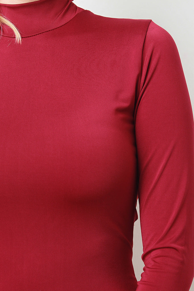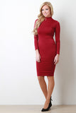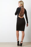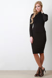 This bodycon dress features a mock turtle neckline, long sleeves, sculpturing silhouette, knee length hemline, backless construction with corset lace-up design. Accessories sold separately. Made in U.S.A. 95% Polyester, 5% Spandex.