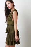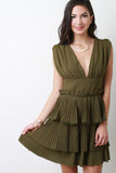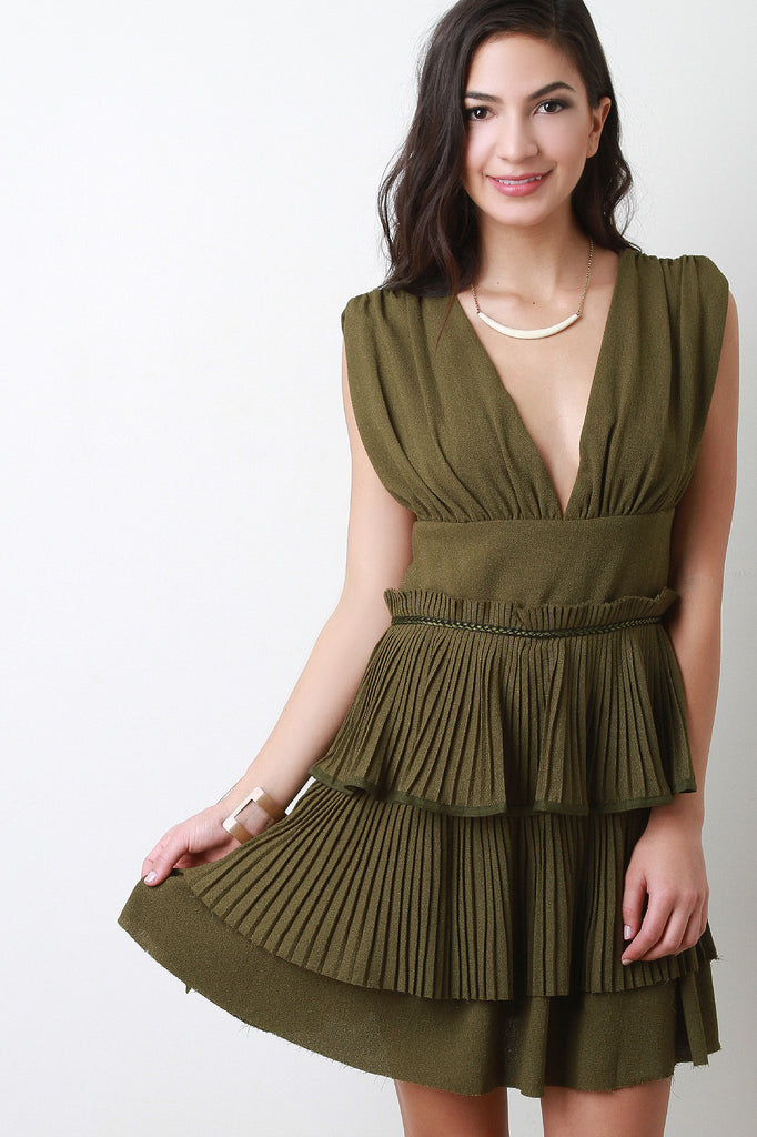 This flowy cocktail dress features a bodice consisting of two wide straps gathered at the shoulders and waist, open sides, and a keyhole back with button at nape and concealed zipper closure. The high waist skirt features knife pleated layers and a braid accent. Accessories sold separately. 97% Polyester, 3% Spandex.