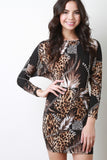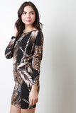 This trendy mini dress features a mixed print fabrication, boat neckline, long dolman sleeves design, and stretchy bodycon fit. Partially lined. Accessories sold separately. Made in U.S.A. Accessories sold separately. 95% Polyester, 5% Spandex.