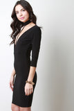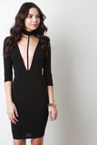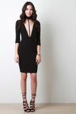 This midi dress features stretch fabric, plunge neckline, collar neck strap with two button closures at nape, open back, long sleeves, and finished with lining. Accessories sold separately. Made in U.S.A. 95% Polyester, 5% Spandex.