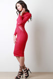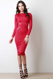 This midi dress features smooth stretch fabric, boat neckline, long sleeves, semi-sheer mesh panels, and back zipper closure. Accessories sold separately. Made in U.S.A. 96% Polyester, 4% Spandex.