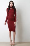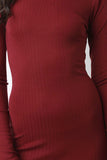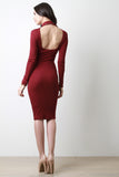 A ribbed jersey knit dress featuring a mock neck, large cutout back window, and long fitted sleeves. Finished with a midi-length bodycon fit. Accessories sold separately. Made in USA. 63% Polyester, 33% Rayon, 4% Spandex.