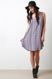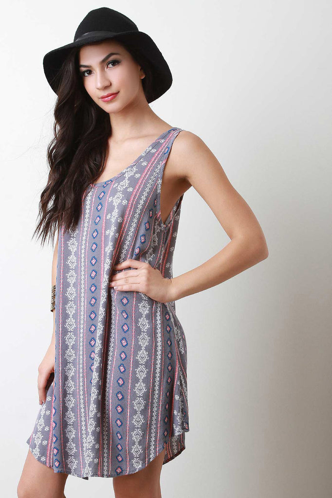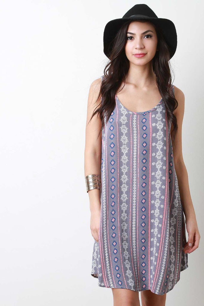 A gauzy shift dress featuring a vertical damask and stripes pattern, a round neckline, and a sleeveless relaxed construction. Accessories sold separately. Made in USA. 100% Rayon.