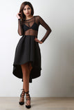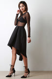 This midi dress features semi-sheer mesh top, round neckline, long sleeves, and pleated high-low scuba knit skirt. Accessories sold separately. Made in U.S.A. 95% Polyester, 5% Spandex.