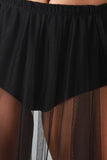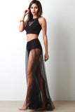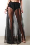 This maxi skirt features an elasticized high rise waist, brief underlay, long flowy semi-sheer mesh maxi, and a high vent slit at left side. Accessories sold separately. Made in U.S.A. 100% Polyester. Contrast: 95% Cotton, 5% Spandex.