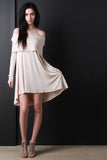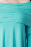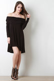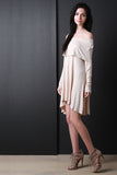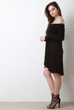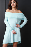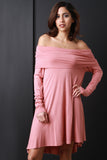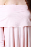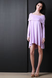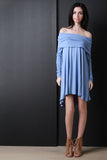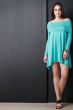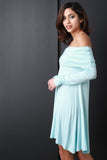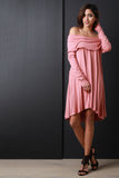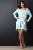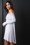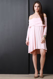 This lovely dress features an elasticized off-the-shoulder neckline, long sleeves design, flare silhouette, and high-low hemline. Accessories sold separately. Made in U.S.A. 95% Rayon, 5% Spandex.