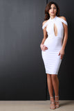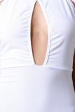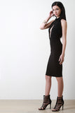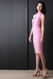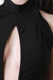 This backless dress features a mock neck with a keyhole shape opening on the chest section of the body, sleeveless, and finished with double button closure at nape. Accessories sold separately. Made in USA. 96% Polyester, 4% Spandex.