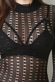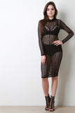This bodycon dress features a semi-sheer mesh fabrication, stretchy silhouette fit, mock neckline, long sleeves, midi length hemline, and zipper fastener at back. Made in U.S.A. Accessories sold separately. 96% Polyester, 4% Spandex.