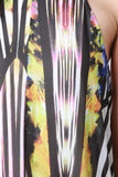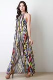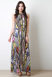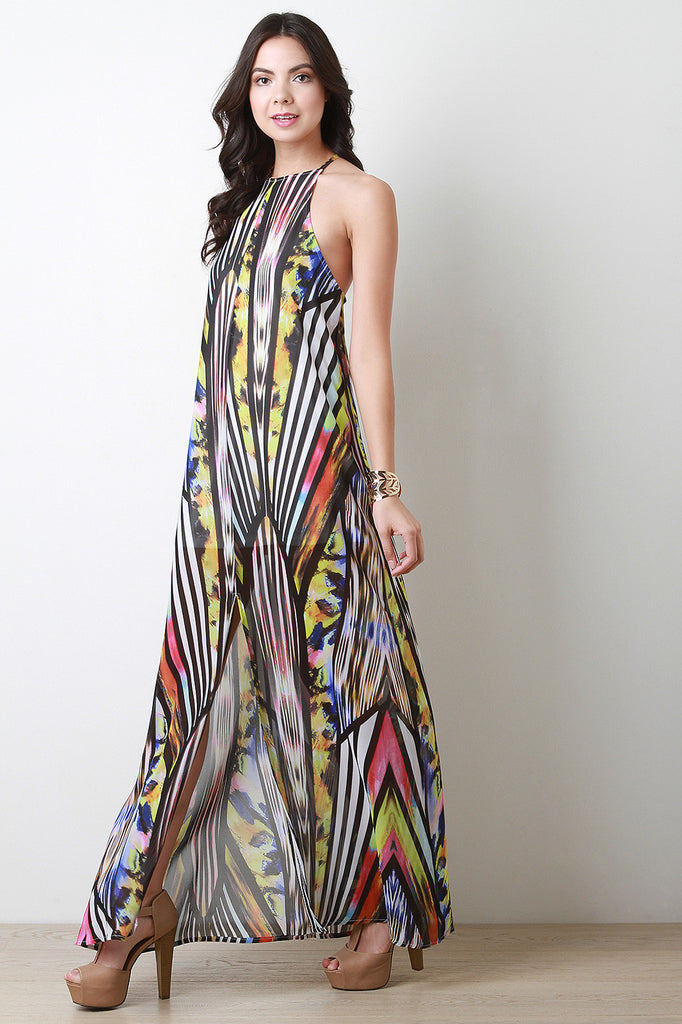 This gorgeous maxi dress features a high neck design with strappy racer back construction, mix media print throughout, deep front slit, and maxi-length hem. Partially lined. Accessories sold separately. Self: 100% Polyester. Lining: 100% Polyester.