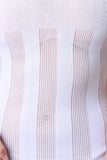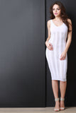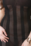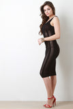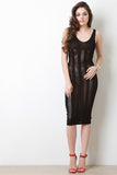 This knit dress features a v-neckline, sleeveless, sculpture stretchy, midi length hemline, and semi-sheer vertical stripes. Accessories sold separately. Made in U.S.A. 70% Rayon, 30% Nylon.